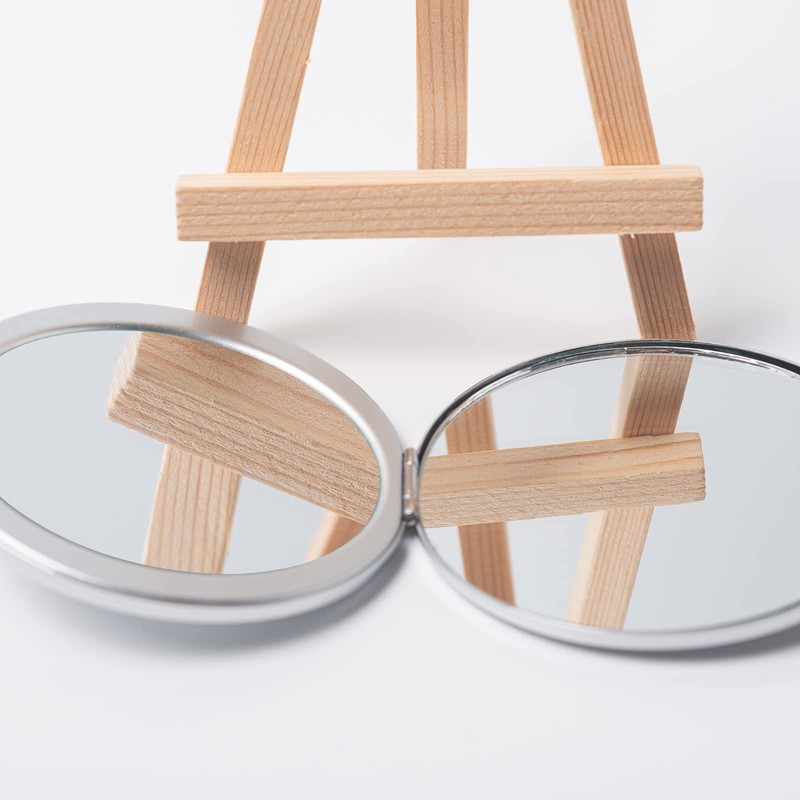 - Carcasa de metal, con espejo de doble cara en el interior. Un lado es un espejo plano convencional 1X, el otro lado es ampliado 2X