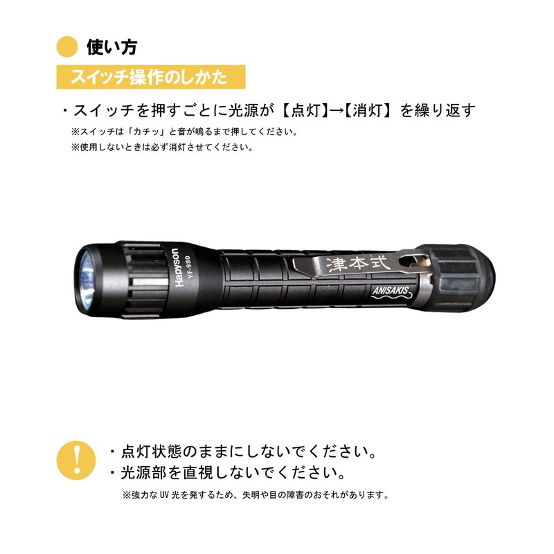 - Light Source: UV LED Waterproof: IPX7 (completely waterproof); UV Strength: Approx. 11 mW/cm2 (measured distance: 7.9 inches (20 cm)); Wavelength: 13.2 oz (365 cm) *Please do not leave it on in a lit state. Do not look directly at the light source. It emits a powerful UV light, which can cause blindness or eye disorders