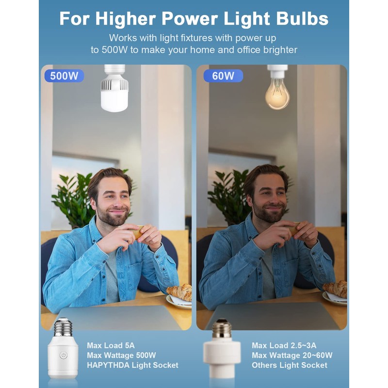 • Wide Compatibility: Our remote control light socket works with most E26/E27 bulbs, including LED bulbs, smart bulbs, CFL bulbs, fluorescent bulbs, corn bulbs, incandescent, halogen or tungsten bulbs etc. It will increase the bulb height by 2.36 inches (6 cm), suitable for AC 80-275V, max load 5 amps, max wattage 500W.