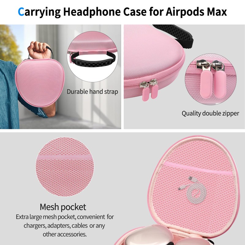 - Hard Carrying Case: Hard Case for Apple AirPods Max Headphones. Made of durable EVA hard shell. Extra large mesh pocket, convenient for chargers, adapters, cables or any other accessories. Double zippers with no pressure to open. Equipped with a comfortable handle for easy carrying.
