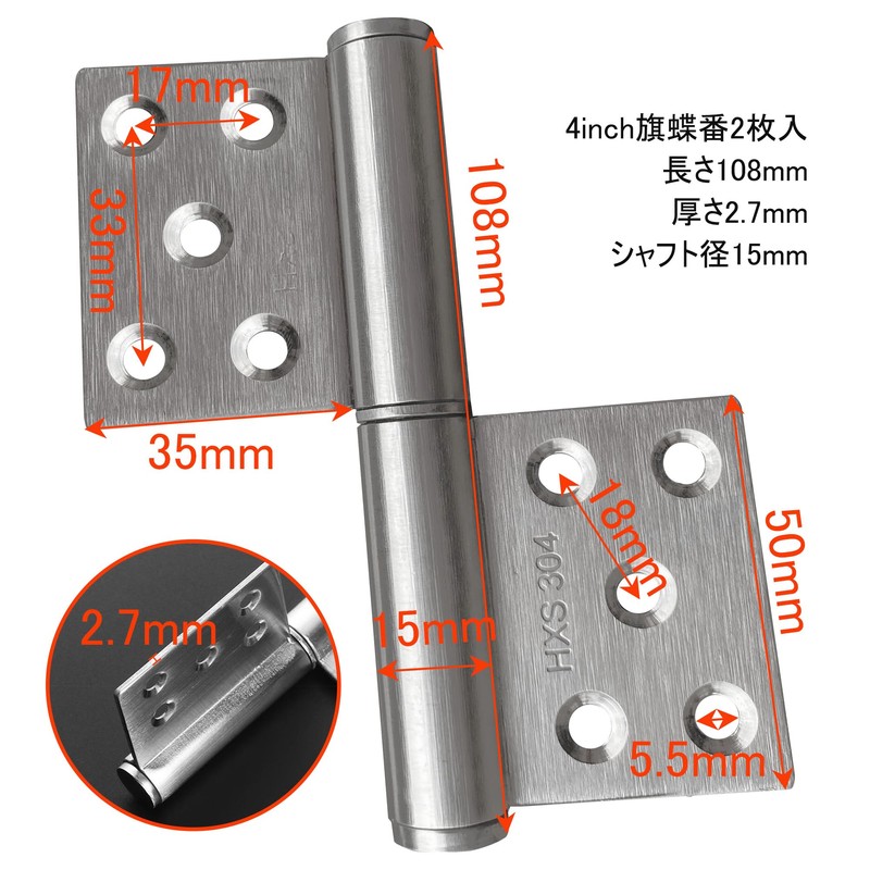 • Package Contents: Includes 2 4-inch flag hinges, length 4.3 inches (108 mm), thickness 0.1 inches (2.7 mm), shaft diameter 0.6 inches (15 mm)