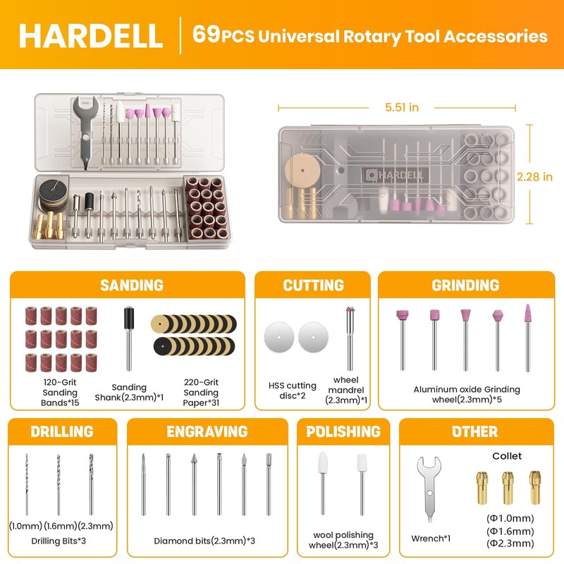 - 【Wide Application】:Made of high - quality materials, HARDELL's 69 pcs rotary tool accessories are perfect for grinding, engraving, polishing, cutting, and drilling in DIY small projects and resin handicrafts.Note: The size of the accessories is 1.0mm-2.3mm, and is only suitable for small DIY projects, figures, resins and other light tasks。