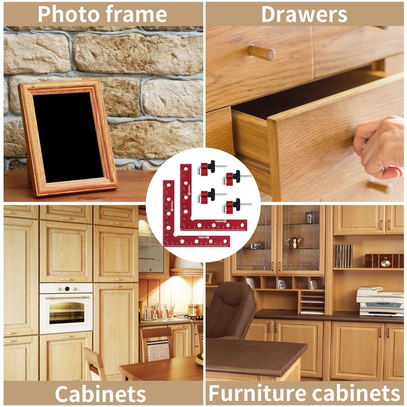 - 【Wide Application】This 14cm carpentry right angle jig set is professionally used to assemble boxes, drawers, cabinets, frames, furniture cabinets, etc. At the same time, this clamping square for woodworking has precise graduations and can be used as a ruler. Perfect for squaring up shelf cabinets and keep a square while assembling frames, cabinets, or just about any box