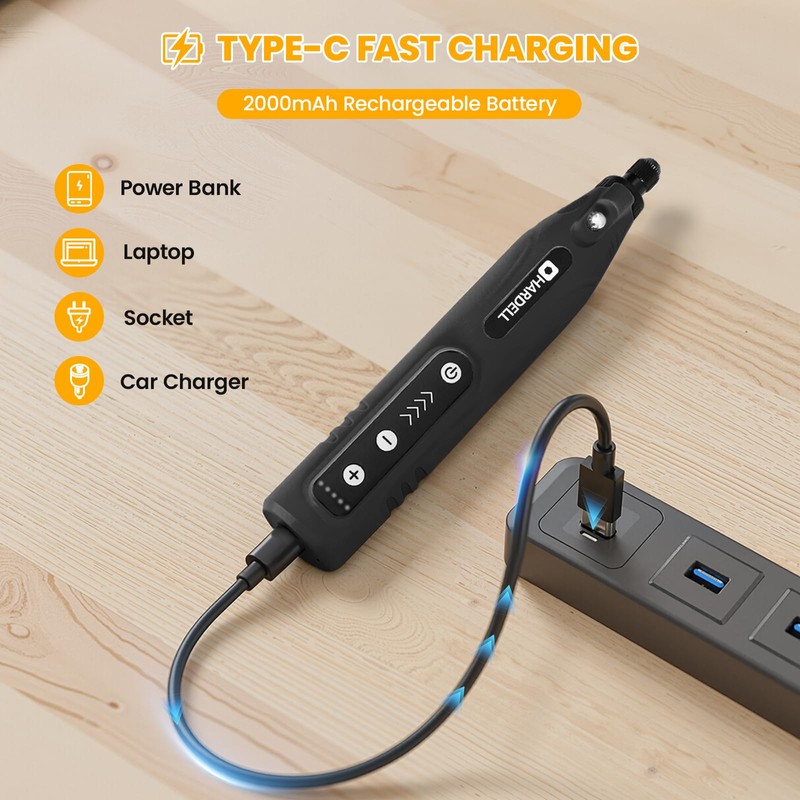 - 【TYPE-C Fast Charging&2000mAh Battery】 - This 4V rotary tool features a built-in 2000mAh battery, offering up to 30-50 minutes of battery life (for small projects) on a full charge, allowing you to focus on fine carving, batch polishing, or sanding large areas. The included Type-C charging cable is compatible with car chargers and power banks, providing flexible and fast charging. Say goodbye to searching for outlets and lengthy charging waits!