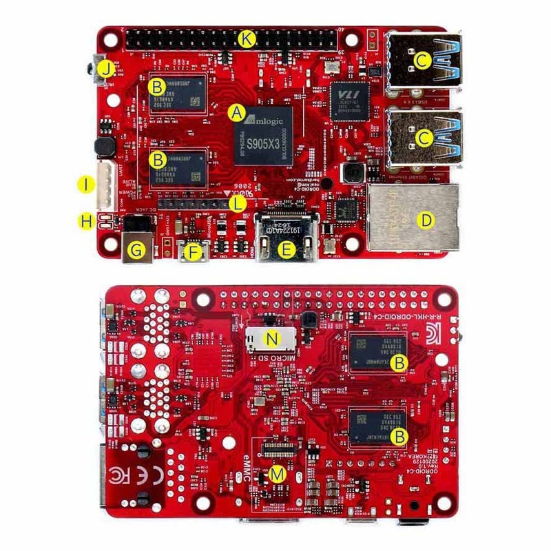 Includes 12V 2A power supply ODROID-C4 is a new generation single board computer that is more energy efficient and faster performing than ODROID-C2 which was introduced over four years ago as the world’s first affordable ARM 64bit computer. The main CPU of the ODROID-C4 is built with a quad-core Cortex-A55 cluster with a new generation Mali-G31 GPU. The A55 cores run at 2.0Ghz without thermal throttling using the stock heat sink allowing a robust and quiet computer. The CPU multi-core performance is around 40% faster, and the system DRAM performance is 50% faster than the ODROID-C2. CPU (Amlogic S905X3) 2 x System LED indicators DDR4 memory (4GiB) 1 x UART for system console 4 x USB 3.0 host ports 1 x IR receiver 1 x RJ45 Ethernet port (10/100/1000) 40 x GPIO pins 1 x HDMI 2.0 7 x GPIO pins 1 x Micro USB 2.0 port (OTG) 1 x eMMC module socket 1 x DC power jack (Outer diameter : 5.5mm, inner diameter : 2.1mm) 1 x Micro SD slot