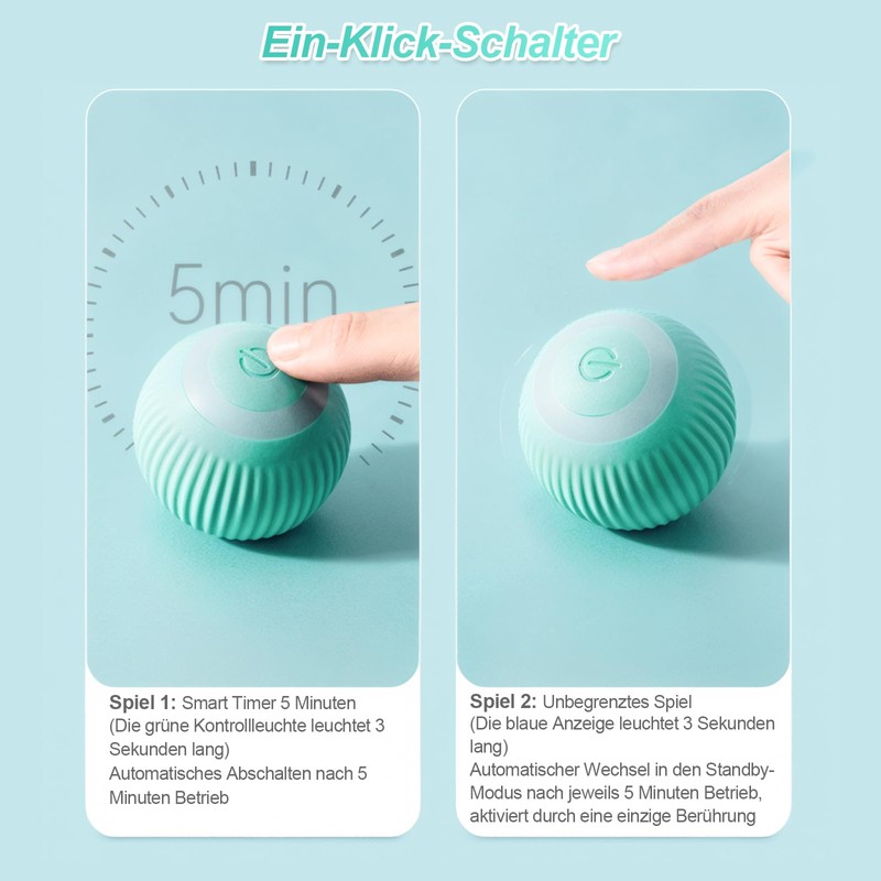 • Intelligent dual mode: (1) normal mode (green light lights up for 3 seconds): runs for approx. 5 minutes and then stops automatically; (2) Intelligent mode (blue light lights up for 3 seconds): after starting the ball, press and hold the button to activate the intelligent mode; runs for approx. 5 minutes and then stops automatically; can be restarted after rolling a circle or typing. A USB charging cable is included in the package. Please fully charge it when you use it for the first time.