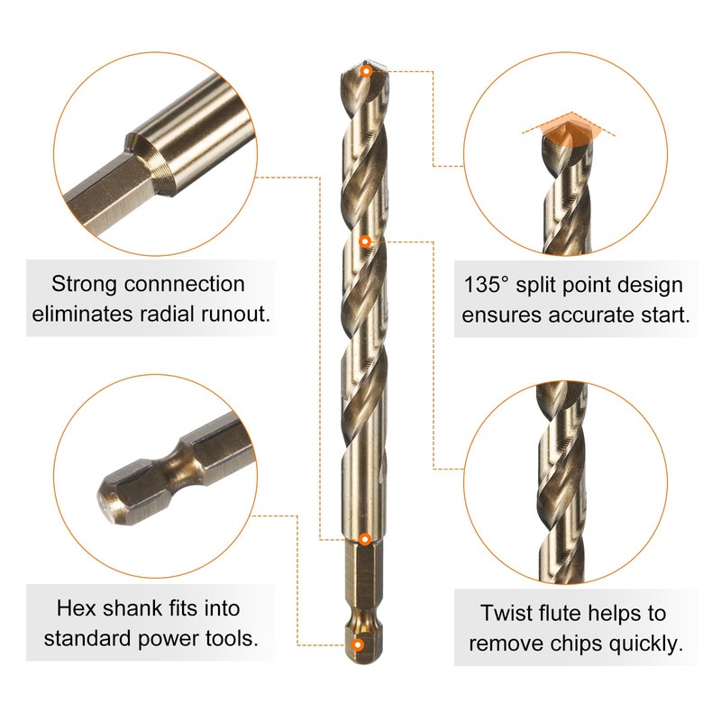 - Feature - 1/4" hex shank fits all standard power tools and impact drivers and installs quickly and easily into quick-change chucks; the 135° split point design ensures accurate start and automatic centering, reducing thrust for increased drilling speed and accuracy.