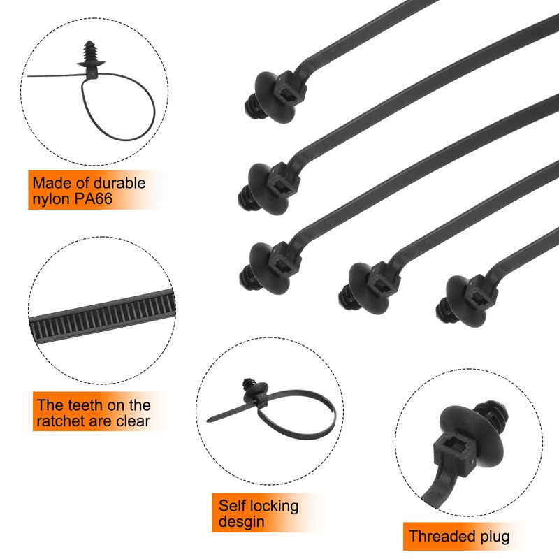 • Feature - The cable tie head features a threaded plug in design that secures cables to substrates or walls of various thicknesses to enhance the stability of installed pipes and wires. The self-locking design of the cable tie makes the bundle firm, not easy to loosen, easy to operate, and also prevents jamming.
