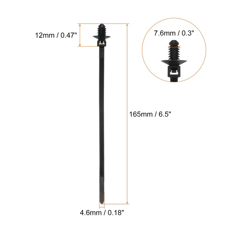 • Size - Cable ties length & width: 6.5 x 0.18 inch / 165 x 4.6mm; thickness: 0.05 inch / 1.2 mm; head length: 0.47 inch / 12 mm; head diameter: 0.3 inch / 7.6 mm; load capacity: 52.86 lb / 24 kg. Package includes 100pcs black push mount cable zip ties.