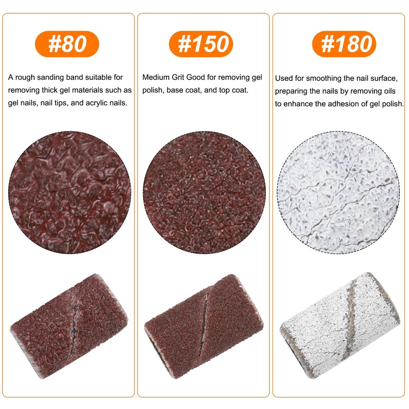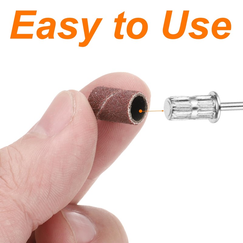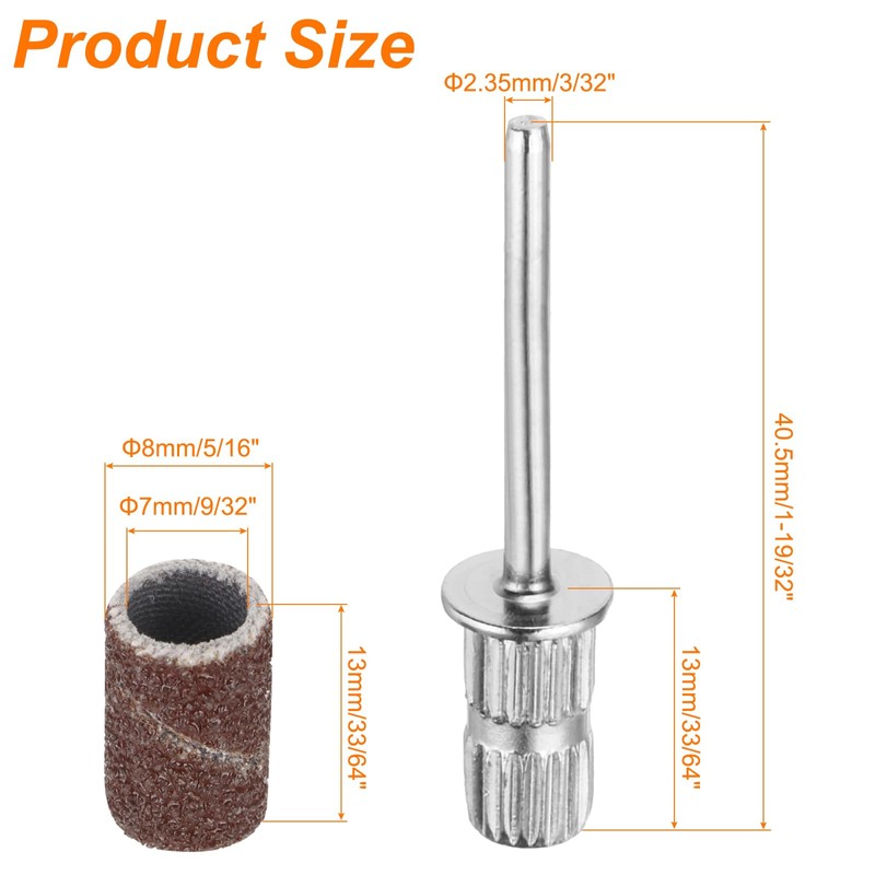 - Size - Our nail drill sanding bands have a precision 80# grit, designed for efficient manicure and pedicure treatments. Measuring at 7mm(9/32") inner dia. by 8mm(5/16") outer dia. and 13mm(33/64") in length, these bands fit snugly on a 6mm(15/64") stainless steel mandrel. The mandrel itself comes in dimensions of 13mm(33/64") length with a 2.35mm(3/32") shank dia., ensuring a stable and secure attachment, while its total length extends to 40.5mm(1 19/32“) for comfortable handling.
