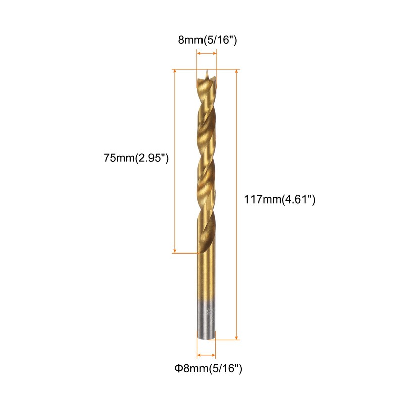 • Size - The brad point drill bit has a diameter of 8mm(5/16") and a straight shank diameter of 8mm(5/16"), an overall length of 117mm(4.61"). The maximum cutting depth can be up to 75mm(2.95").
