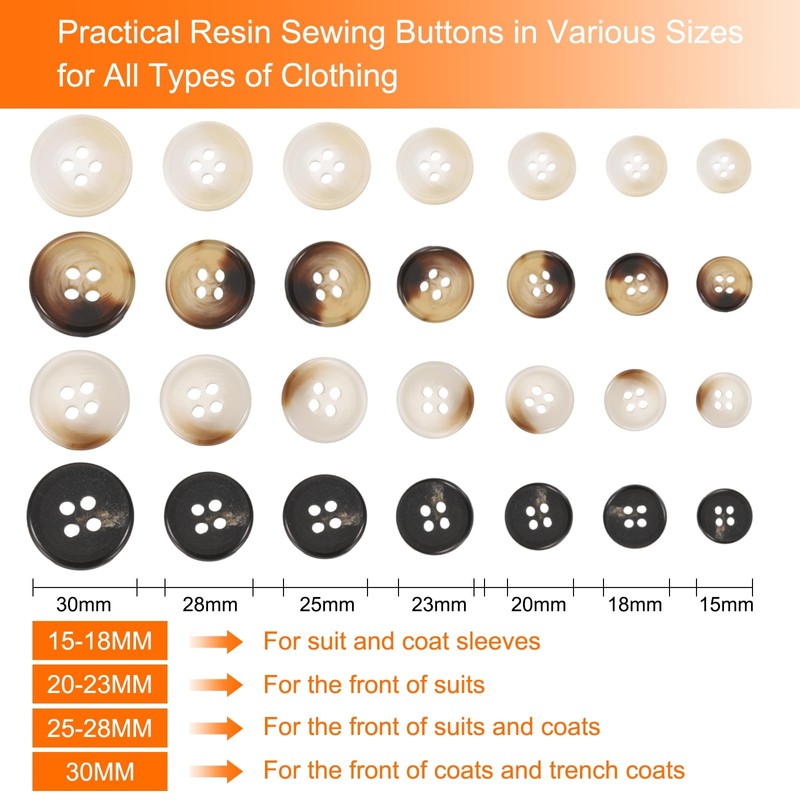 - Applications - These practical resin sewing buttons are good for a wide range of uses, including sewing, knitting, crocheting, and replacing buttons on various types of clothing. They are great for craft projects and DIY creations, allowing you to embellish clothes and add a personal touch to accessories such as trench-coats, jeans, suits, hats, dresses, sweaters, shoes, backpacks, jackets and handbags, necklaces, and bracelets.