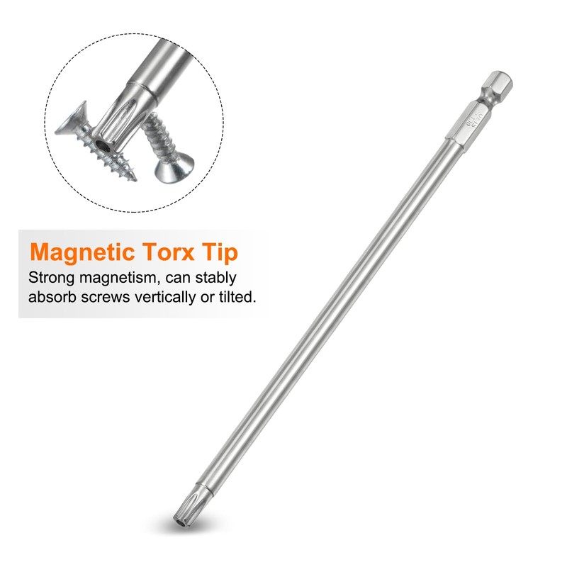 - Size - Tamper-proof torx bit size: T30, hex shank size: 1/4", total length: 150mm / 6", hardness: HRC58-60, style: torx head with hole. Each hex screwdriver bit is clearly engraved with size number for easy identification.