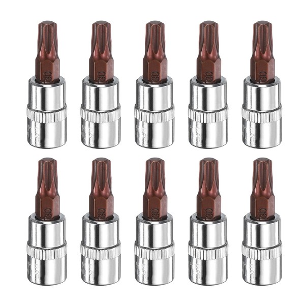 HARFINGTON 10pcs T30 Torx Bit Socket 1/4" Square Drive Star 6 Point S2 & CR-V Steel Socket Ratchet Wrench Bits, Silver Red