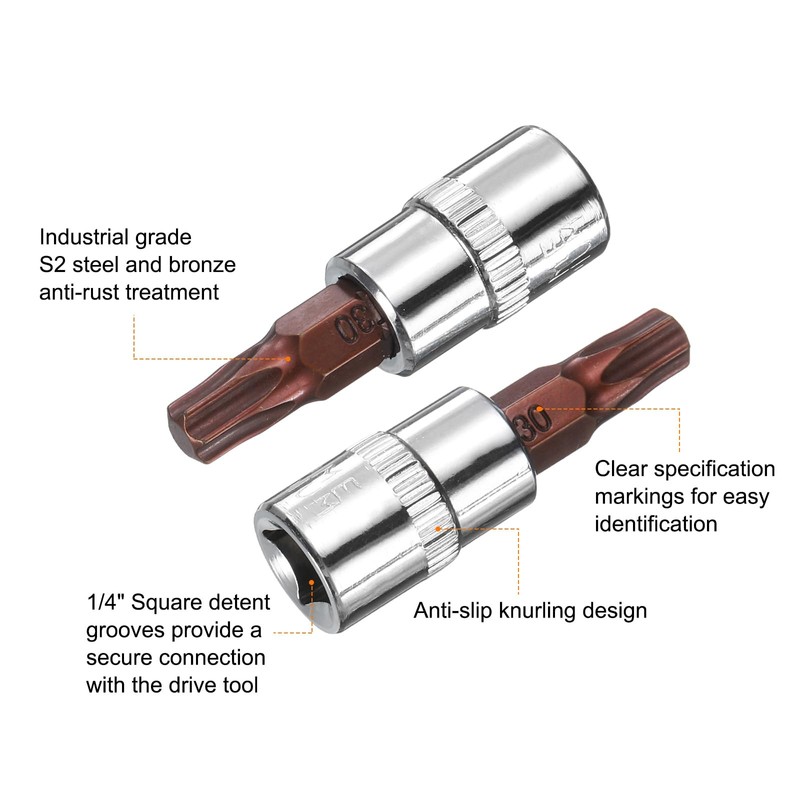 • Size - T30, 1/4" drive, Total Length: 36mm / 1.42"; The beveled chamfer design can be easily, smoothly and accurately inserted to protect the drill bit and fasteners from damage