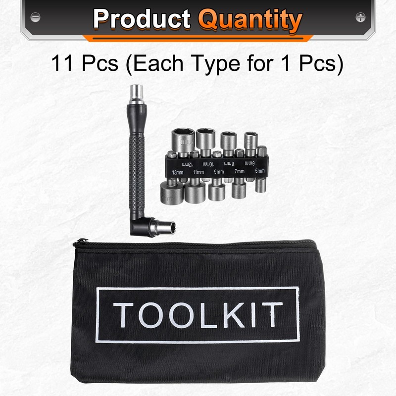 HARFINGTON 11pcs Power Nut Driver Drill Bit Set 5/6/7/8/9/10/11/12/13mm Metric Magnetic 6-Point Drill Socket 1/4" Hex Shank with L-shaped Manual Wrench and Storage Bag