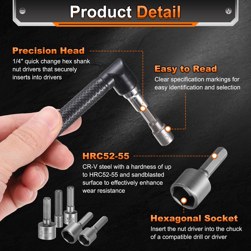 - Material - The nut driver drill bit set is made of CR-V steel with a hardness of up to HRC52-55, which is durable and resistant to bending. The surface is sandblasted to effectively enhance wear resistance