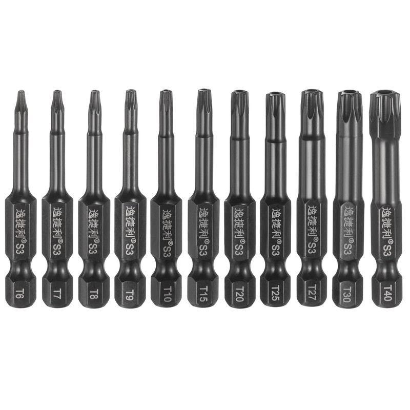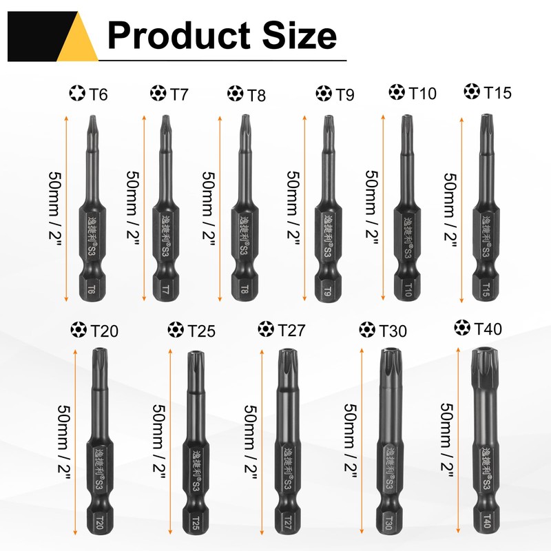 • Size - Security torx head size: T6, T7, T8, T9, T10, T15, T20, T25, T27, T30, T40; Hex shank size: 1/4"; Overall length: 50mm (2"); Hardness: HRC58-60 (the generally accepted stable hardness is approximately HRC60). Style: Torx with Hole. Each hex screwdriver bit is clearly engraved with the size number for easy identification.