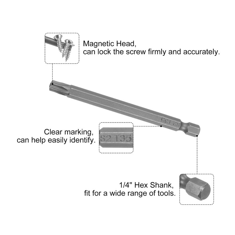 - Size - Type: T6, T7, T8, T9, T10, T15, T20, T25, T30, T35, T40; Total Length: 100mm / 4"; Shank Diameter: 1/4". You will receive 11pcs screwdriver bits in one package.