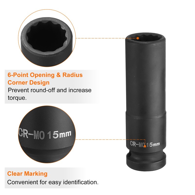 - Size - Drive: 1/2-inch, 12-Point Socket Size: 15mm, Total Length: 78mm / 3.07-inch. The specifications are clearly marked on the surface of the socket, which is easy to identify and improves work efficiency.
