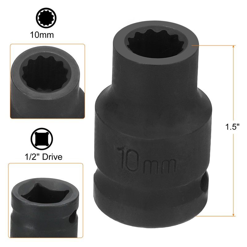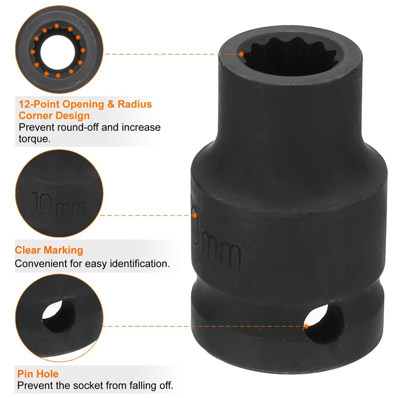 - Size - Drive: 1/2-inch, 12-Point Socket Size: 10mm, Total Length: 1.5-inch. The specifications are clearly marked on the surface of the impact socket, which is easy to identify, improving work efficiency.