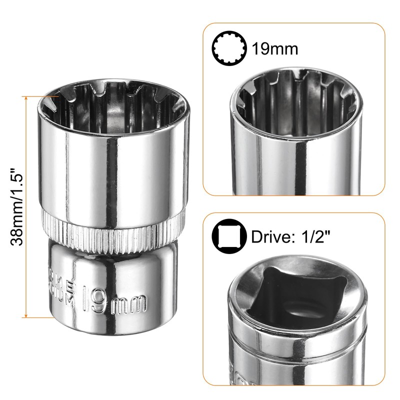 - Size - Drive: 1/2"; Socket Specifications: 19mm; Total Length: 38mm / 1.5"; Package Includes: 1 x 12 Point Socket. The specifications of the socket are engraved on the surface and are visible. You can quickly switch between different socket sizes while working to improve work efficiency.