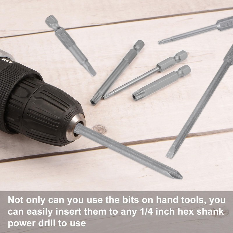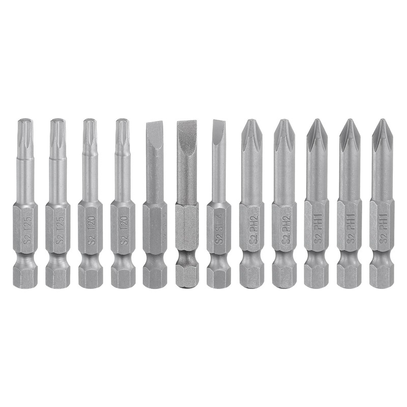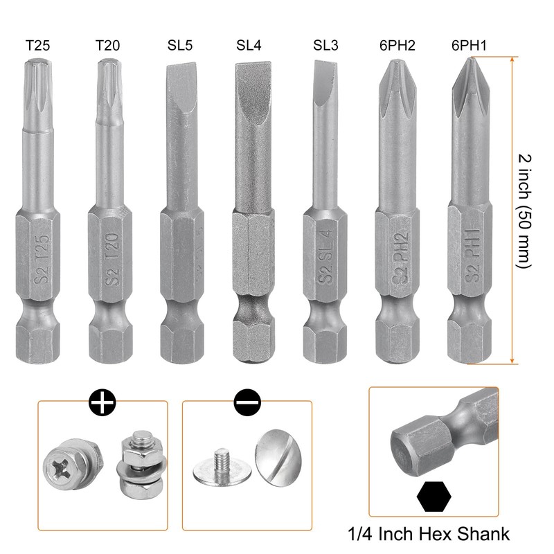 - Size - 12Pcs Screwdriver Bit Set: Included 5pcs Phillips Cross Head PH1(6.0) PH2(6.0), 3pcs Slotted Head SL4/5/6 and 4pcs Torx Head T20/T25; Total Length: 2 inch (50 mm)