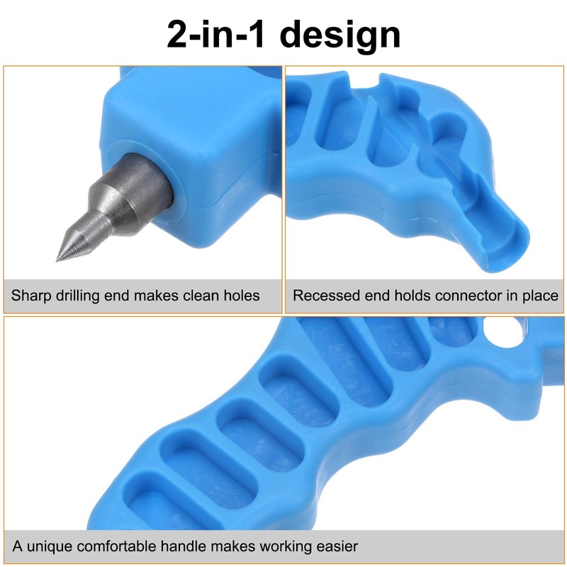 - Feature - The two-in-one design can make connector connecting easier. Punches the perfect size hole to attach fittings and couplers. The uniquely shaped handle of irrigation fittings installation tool feels comfortable and you won't feel tired after long-term use.