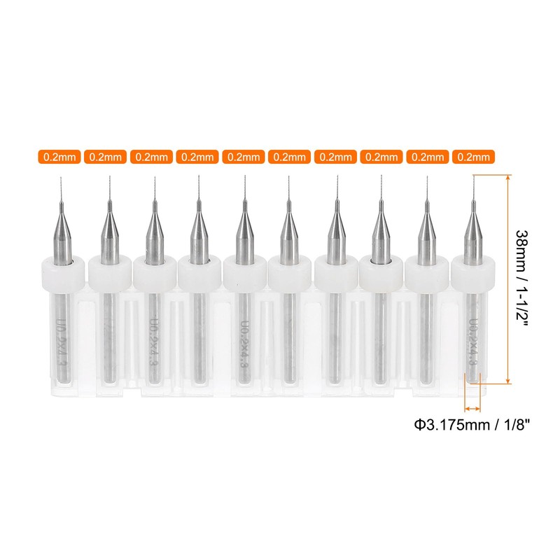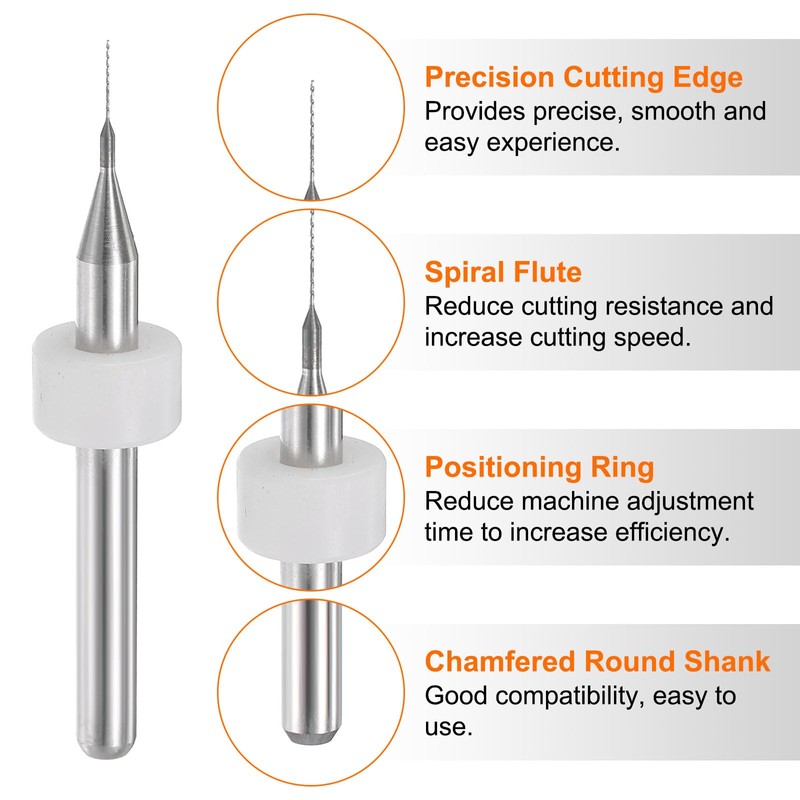 - Size - Cutting edge diameter: 0.75mm / 0.03"; shank diameter: 3.175mm / 1/8"; overall length: 38mm / 1-1/2"; special design: with positioning ring. 1set (20pcs) micro drill bits are available to meet PCB drilling needs.