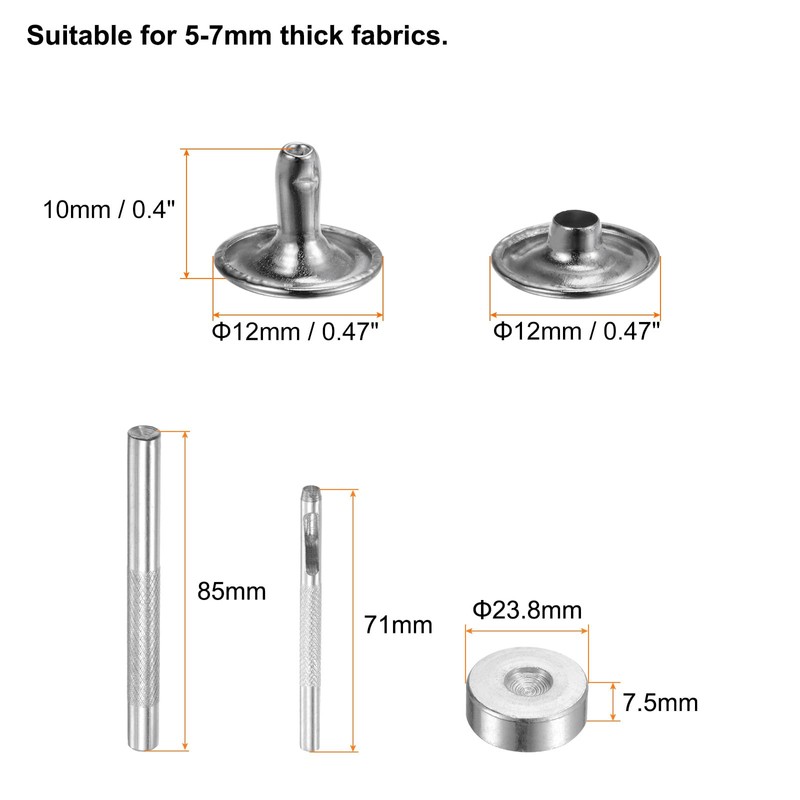 - Size - This leather rivets kit includes 200 Sets of 12mm x 10mm rivets, suitable for 5-7mm thick fabrics.
