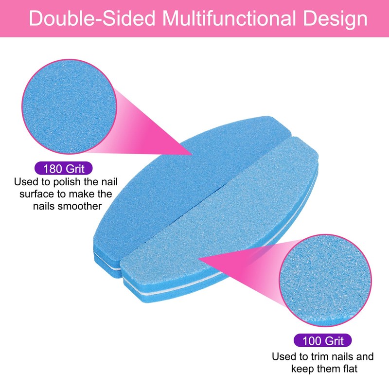 - Feature - The double-sided design combines two different grits of 100 and 180. The 100 grit is used to trim nails and help remove uneven parts, and the 180 grit is used to polish the nail surface to make the nails smoother. It can complete multiple care steps at one time, improve care efficiency, and make nail care more efficient. The small size is easy to carry; it is more flexible to use and can complete more detailed nail care.