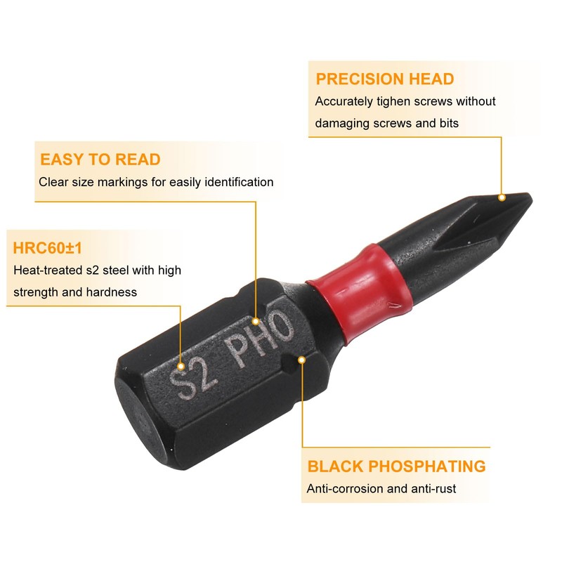 - Size - PH0; Total Length: 25mm / 1"; Shank: 6mm/ 1/5 inch hex shank; Phillips head drill bit specifically designed for driving screws into wood, metal, and other materials effortlessly. Can accurately tighten screws without damaging screws and screwdriver bits