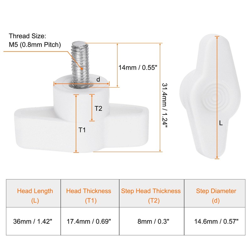 - Size - Standard Thread Size: M5 (0.8mm Pitch); Thread Length: 14mm / 0.55"; Wing Head Size: 36mm x 17.4mm / 1.42" x 0.69"; Total Length: 31.4mm / 1.24"; Knob Style: T/Z; Color: White. ( Threads are neat and clear, the force is even and deep, not easy to slip, and there are no burrs.)