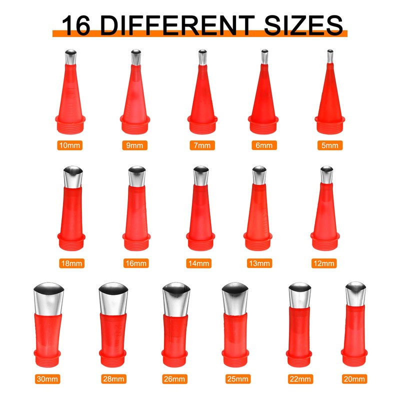 - Size - The package contains 16 different sizes of caulking nozzles of 5mm, 6mm, 7mm, 9mm, 10mm, 12mm, 13mm, 14mm, 16mm, 18mm, 20mm, 22mm, 25mm, 26mm, 28mm and 30mm, with 6 connection bases. There are clear specification markings on the surface of caulking nozzle set for easy identification and use. You can choose the appropriate model to use as needed.