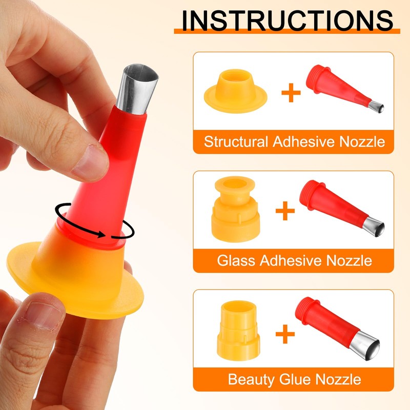 There are clear specification markings on the surface of caulking nozzle set for easy identification and use. You can choose the appropriate model to use as needed. This caulking tool kit can be easily installed without tape, and is equipped with multiple connection bases to ensure that the connection is firm and the caulking nozzle will not shake or fall off when caulking.