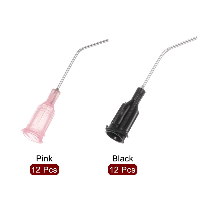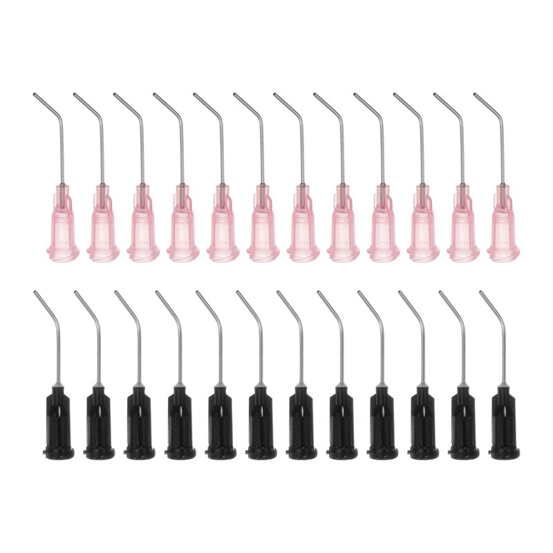 HARFINGTON 24pcs Blunt Tip Dispensing Needles 19G 20G 45 Degrees Bent Dispensing Tips 1" End Angled Dispenser Needle with Luer Elbow Blunt Needle for Oil or Glue Applicator, Black, Pink