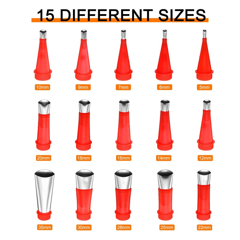 • Size - The package contains 15 different sizes of caulking nozzles of 5mm, 6mm, 7mm, 9mm, 10mm, 12mm, 14mm, 16mm, 18mm, 20mm, 22mm, 25mm, 28mm, 30mm and 35mm, with 8 connection bases and 4 scrapers. There are clear specification markings on the surface of caulking nozzle set for easy identification and use. You can choose the appropriate model to use as needed.