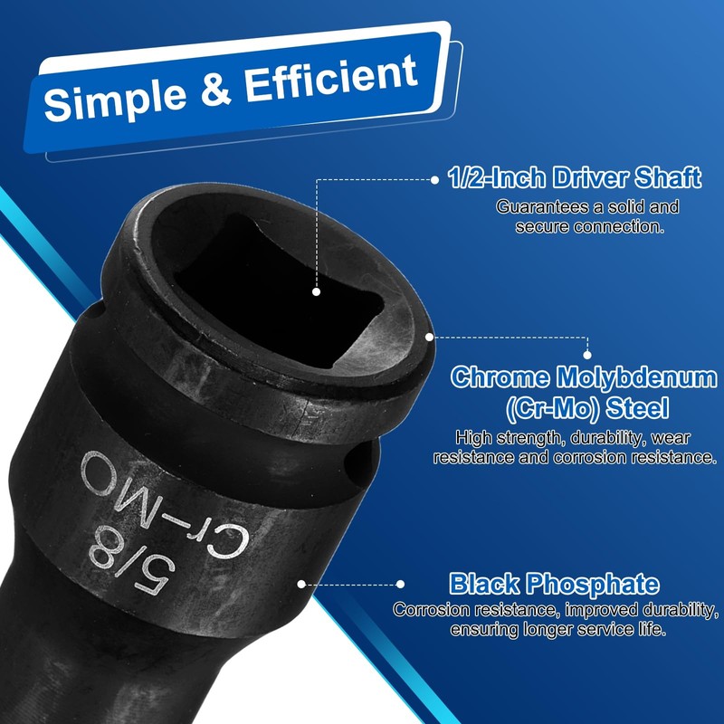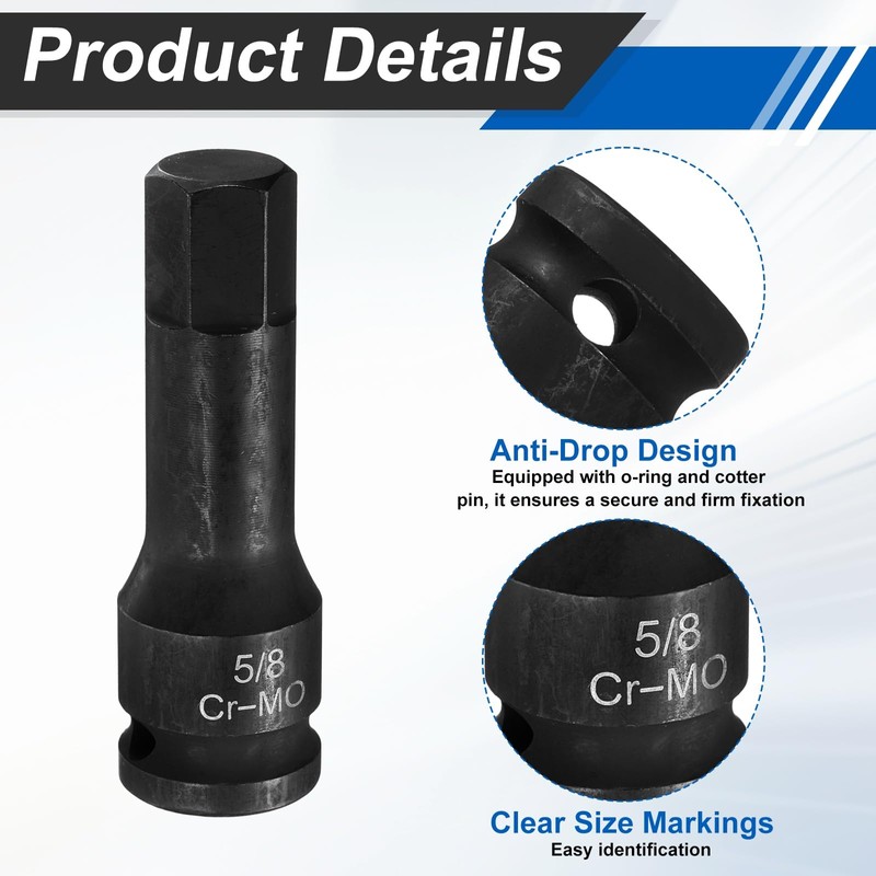 - Size - 5/8 inch 6-point socket; 1/2" square drive socket; 78mm / 3" total length. Each package includes 2pcs x 6-point socket and 2pcs x cotter pin and 2pcs x O-ring