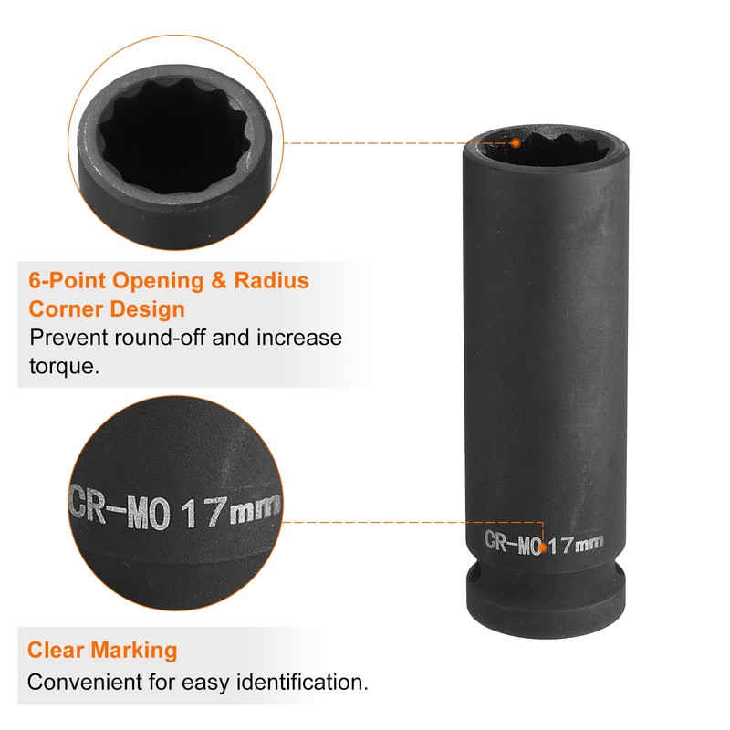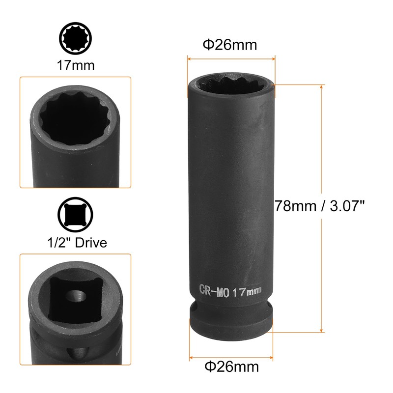 - Size - Drive: 1/2-inch, 12-Point Socket Size: 17mm, Total Length: 78mm / 3.07-inch. The specifications are clearly marked on the surface of the socket, which is easy to identify and improves work efficiency.