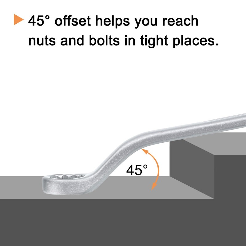 - Feature - Offset double torx wrench can be flexibly converted to use box heads of different sizes. The double 12-point box end and 45 ° offset help you reach nuts and bolts in narrow places. The box end geometry is designed to grasp the flat surface of the fastener head instead of the corner to prevent rounding.