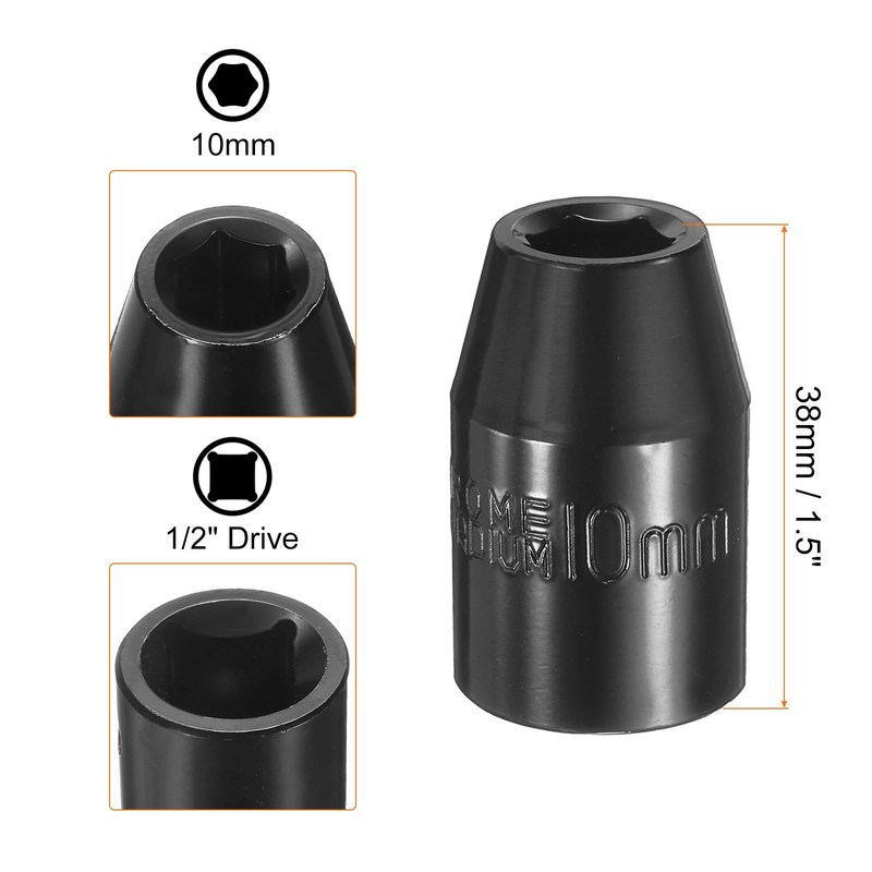 - Size - Metric 6-point socket size: 10mm; square drive size: 1/2"; overall length: 38mm / 1.5" (shallow)