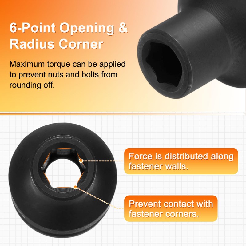 6-point impact socket can be used to install, remove and repair fastening bolts, shaft nuts, bolts on cars, machines, household appliances, engines, etc., suitable for automobile maintenance, mechanical equipment repair, construction, carpentry, home repair, etc.. Used with 1/37-inch electric wrenches, ratchet wrenches, L wrenches, bent rods, etc.