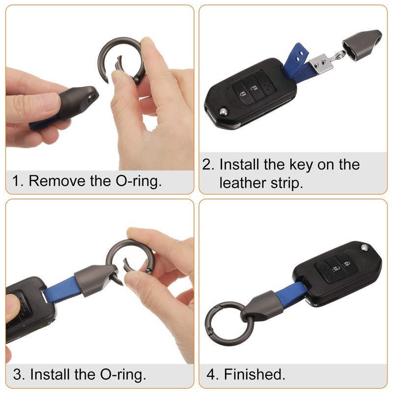 This car key ring is easy to use, just take out the O-ring, remove the leather strip, install the key on the leather strip, and then install the O-ring back in place.