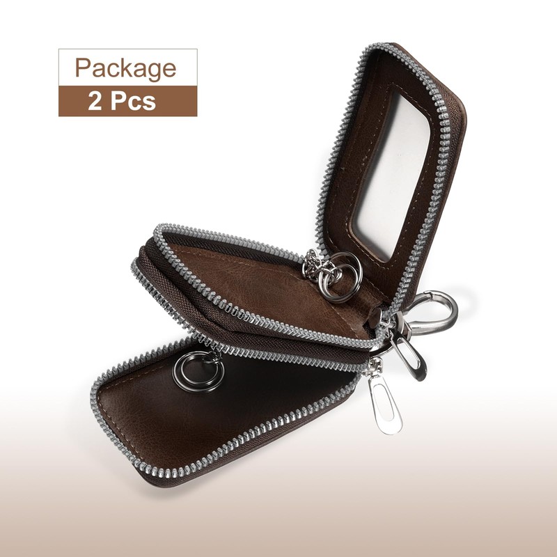 HARFINGTON 2Pcs Double Car Key Fob Case Leather RFID Smart Key Chain Keychain Holder with Metal Hook Keyring Zipper Bag for Remote Key Fob, Brown