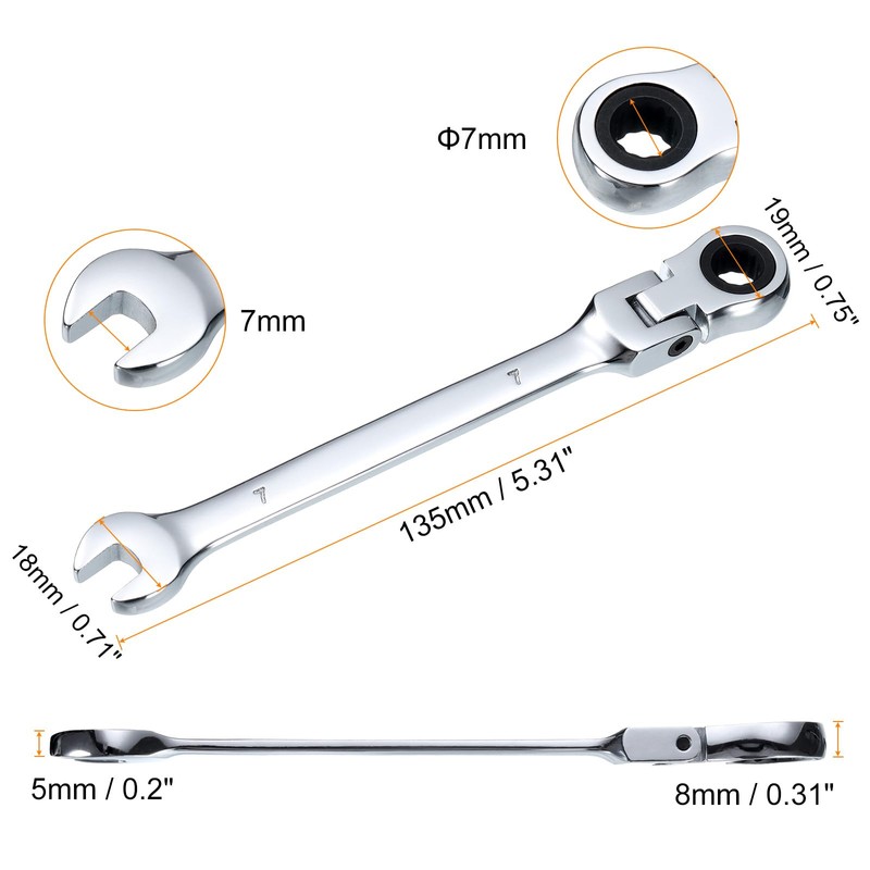 • Size - Specifications: 7mm; total length 130mm / 5.12"; open end width: 18mm / 0.71"; open end thickness: 5mm / 0.2"; round head end width: 19mm / 0.75"; round head end thickness: 8mm / 0.31"; rotation angle: 180 degrees; ratchet teeth number: 72 teeth.