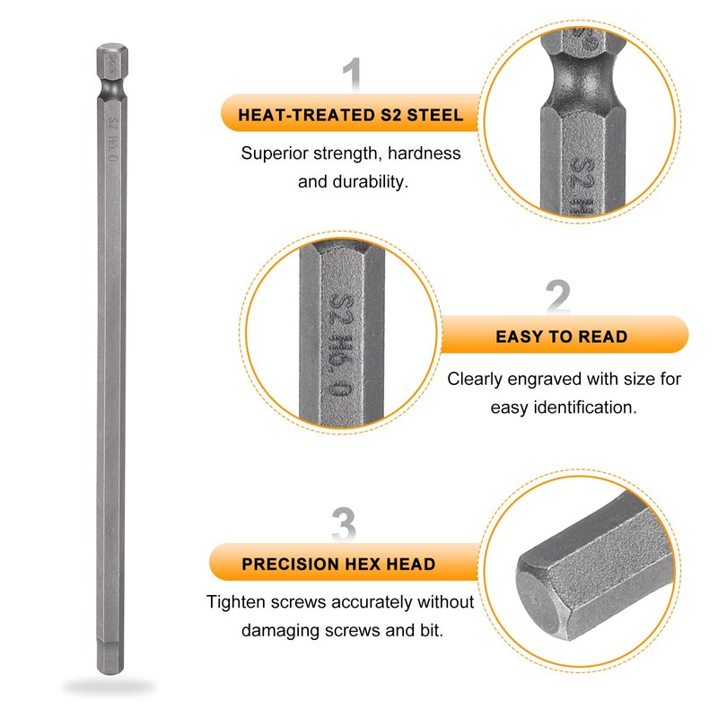 - Size - Metric flat hex head size: H6.0 (6mm); hex shank size: 1/4"; overall length: 300mm (12"); hardness: HRC59-61 (The recognized stable hardness is around HRC60.). The H value indicates the size of the hexagonal head. The larger the value, the larger the head, and the smaller the value, the smaller the head.