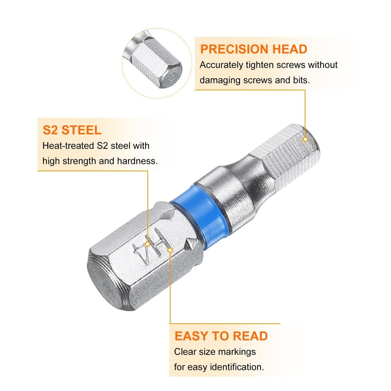 - Size - H4; Total Length: 25mm / 1"; Hexagonal head drill bit specifically designed for driving screws into wood, metal, and other materials effortlessly. Can accurately tighten screws without damaging screws and screwdriver bits.