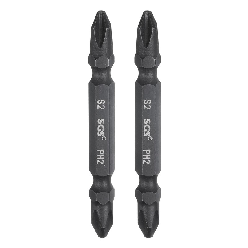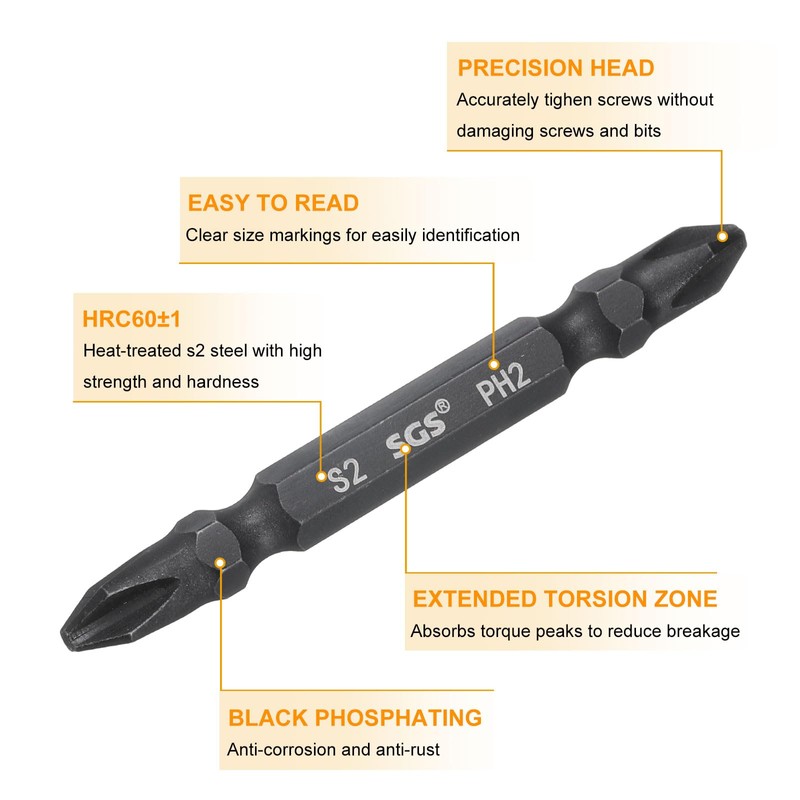 - Material - The double ended Phillips screwdriver bits are made of heat-treated S2 steel with high strength and hardness(HRC60-62), durable and anti-bending, and the surface is sandblasting and black phosphating treatment for enhanced grip and corrosion resistance