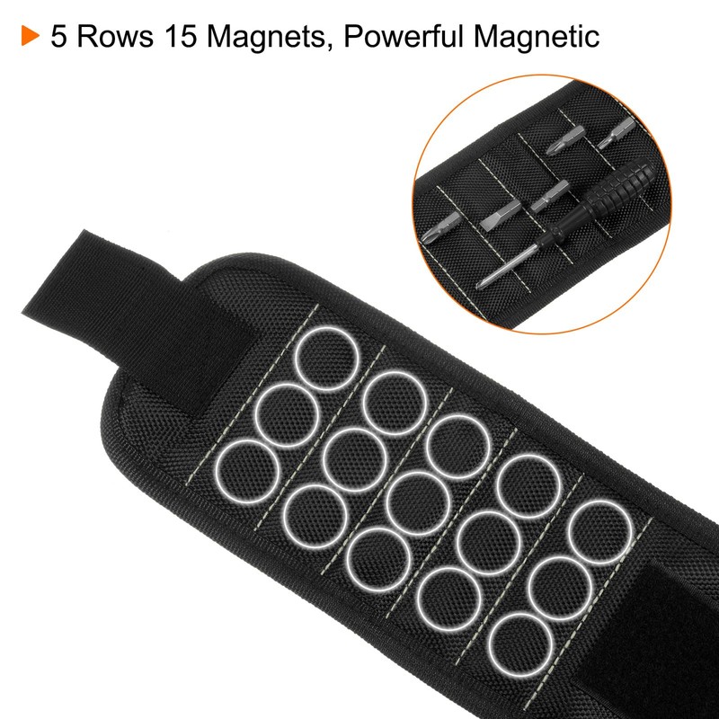 The magnetic wrist band screw holder is equipped with powerful magnets that securely hold screws, nails, drill bits, bolts, fasteners, and other small metal items, providing convenient access and preventing dropping.
