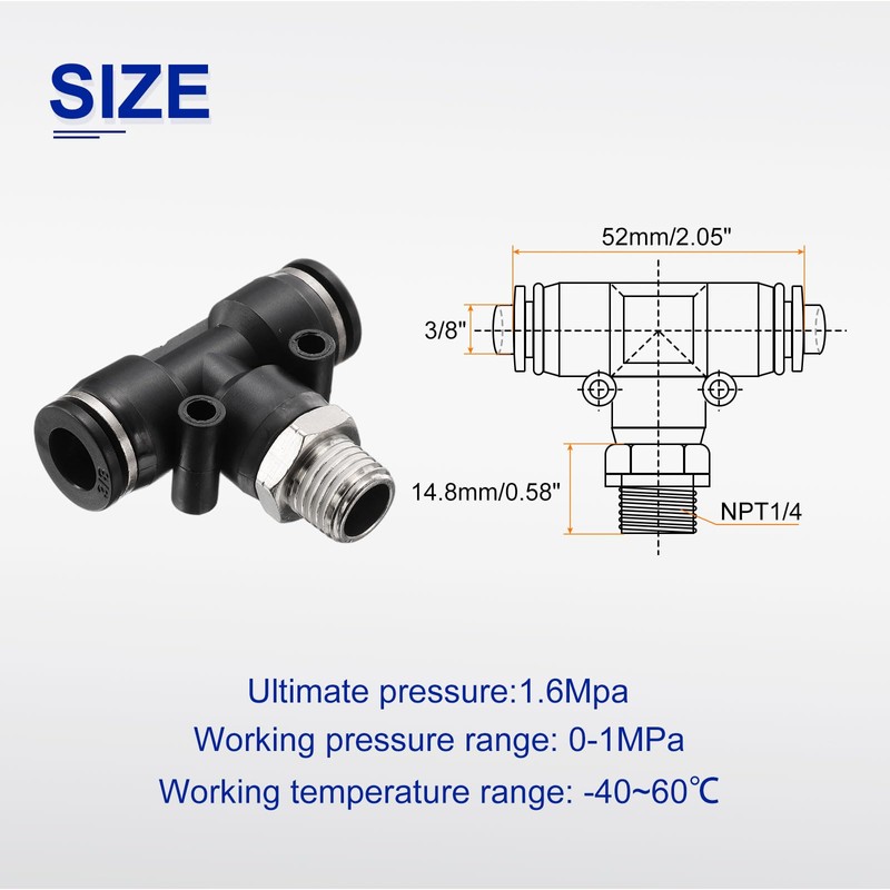 - Size - Branch Tee Connector fittings are 3/8 inch OD tube x 1/4 inch NPT thread; Overall length: 52mm/2.05 inch, Overall width: 14.8mm/0.58 inch, Working temperature range: -40~60℃, working pressure range: 0-1MPa, ultimate pressure:1.6Mpa